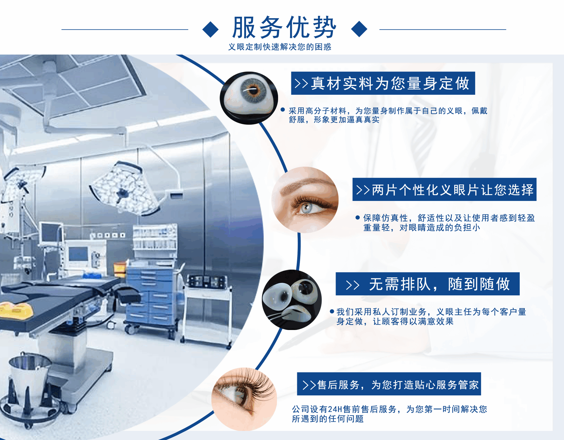 正目醫(yī)療科技有限公司致力于為用戶提供假眼,在哪里可以定制義眼,義眼哪家好,假眼價格,義眼價格,義眼費用,義眼公司,是集義眼定制、保養(yǎng)、咨詢?yōu)橐惑w的綜合性義眼定制企業(yè)。  獨創(chuàng)的義眼工藝結(jié)構(gòu),根據(jù)仿生物學(xué)原理,采用進口醫(yī)用植入材料:高分子材料、無毒素、性能穩(wěn)定、堅固耐用)、聚甲基丙乙烯阝-羥乙酯HEMA材料(軟性親水性材料),結(jié)合獨特的義眼個性化佩戴技術(shù),按佩戴者健眼的形態(tài)、角膜、虹膜、及瞳孔的大小、色澤、血管紋理和脂肪分布,設(shè)計制作。擁有超薄、質(zhì)輕、光滑、親水透氧、佩戴舒適和高逼真的特點。為保證佩戴效...